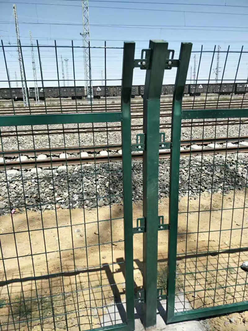鋼筋混凝土立柱金屬網片防護柵欄可采用單開門或雙開門兩種形式。單開寬度1.5m,雙開寬度3m,其網片形式與防護柵欄保持一致,并通過銷鈾、銷鈾套與立柱連接。